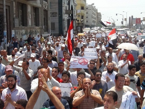وانضم للمتظاهرون مسيرة للإخوان المسلمين من الجمعية الشرعية بعد مرورها بشارع بورسعيد مرورا بشارع الجمهورية والمختلط ووصولاً لميدان تحرير المنصورة حيث ردد المتظاهرون بالصفارات تارة وبالشعارات تارة أخري: يلا أرحل يا مشير .. يسقط يسقط حكم العسكر .. أحنا الشعب الخط الأحمر.